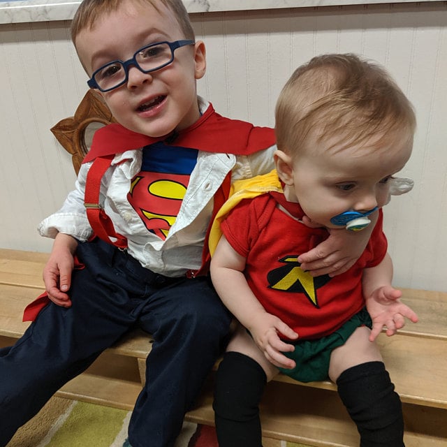 Boys Baby Toddler Halloween Cosplay Costume. All 5 Pieces are included. Everything you need to dress your little one up as Robin. (Onesie - Diaper Cover - Cape - Leg Warmers & Mask) He will look just like Bat - mans little side kick all done up his adorable little costume made just for him. Pictures with Daddy in a Bat - man shirt and him in his Robin costume, also perfect for twins as we also have a Bat - man Costume on my website.